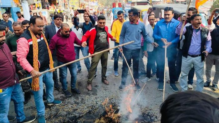 In the middle of Dhubri town, an effigy of senior Congressman Rahul Gandhi was set ablaze by the Bharatiya Janata Party's (BJP) OBC Morcha in a heated protest.
