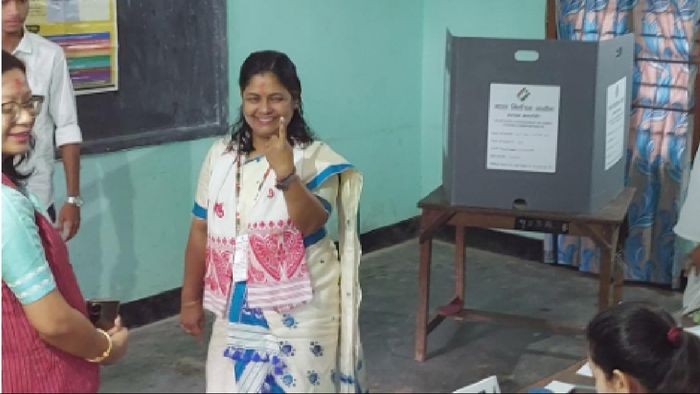 Bharatiya Janata Party (BJP) candidate Bijuli Kalita Medhi cast her vote at Pub Guwahati High school, Jyoti Nagar, Bamunimaidan, Guwahati, Assam on May 7.