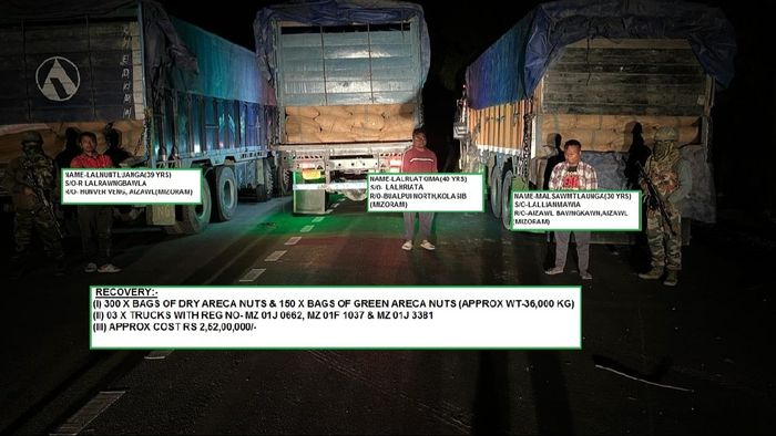 A combined team of Assam Rifles with representatives of the state police department in Champhai, based on specific information carried out a joint operation and recovered the consignment from three trucks bearing numbers MZ 01J 0662, MZ 01F 1037 and MZ 01J 3381.