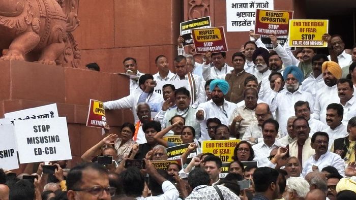 In a dramatic show of unity and dissent, members of various opposition parties staged a protest on the Parliament premises on Monday, July 1, against the central government's alleged misuse of central agencies, including the Directorate of Enforcement (ED) and the Central Bureau of Investigation (CBI).
