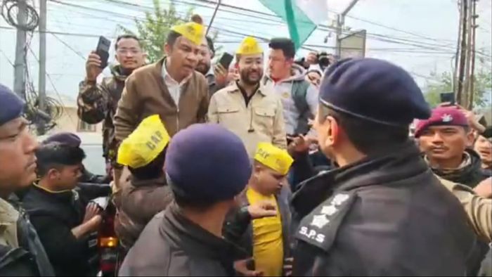 Citizens Action Party (CAP) Sikkim stages a protest rally from Gangtok's Amdo Golai to District Administration Centre against the selling of state government's stake in Teesta Urja Private Limited to Greenco.