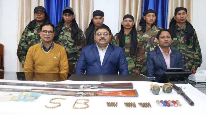 “They surrendered before Krishnendu Chakravertty, DIGP(Intelligence) at Special Branch in Agartala with two Chinese rifles, one Country made Sten gun, six 70mm live rounds, two Chinese Grenade, 7.62 live rounds-15 Nos, two Extortion notice books and Bangladesh taka 1000/-”, said the press release.