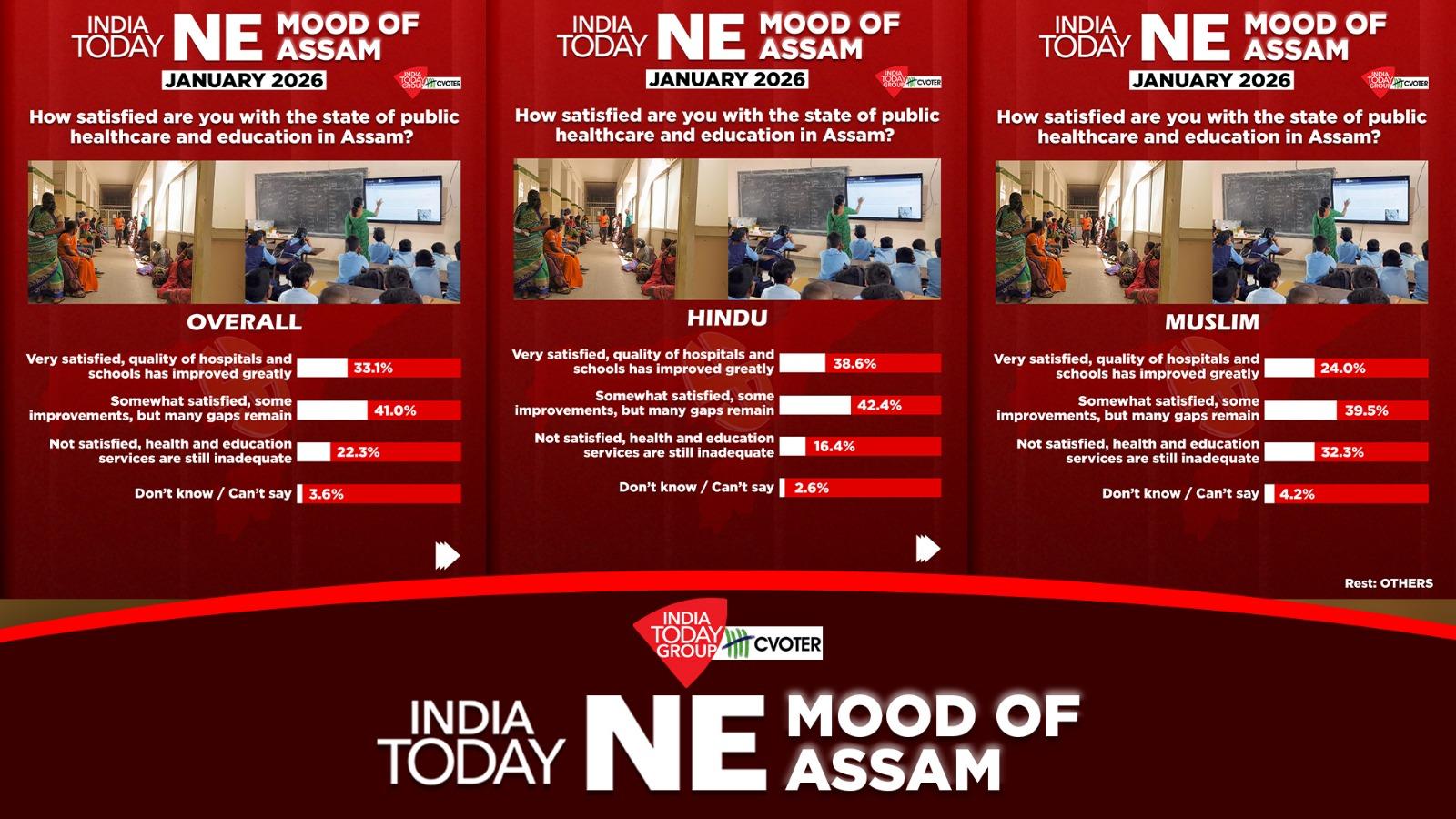 Public satisfaction with healthcare and education services in Assam shows cautious optimism, though significant gaps and sharp variations across communities remain, according to the latest India Today–CVoter Mood of the Nation (MOTN) survey conducted in January 2026.