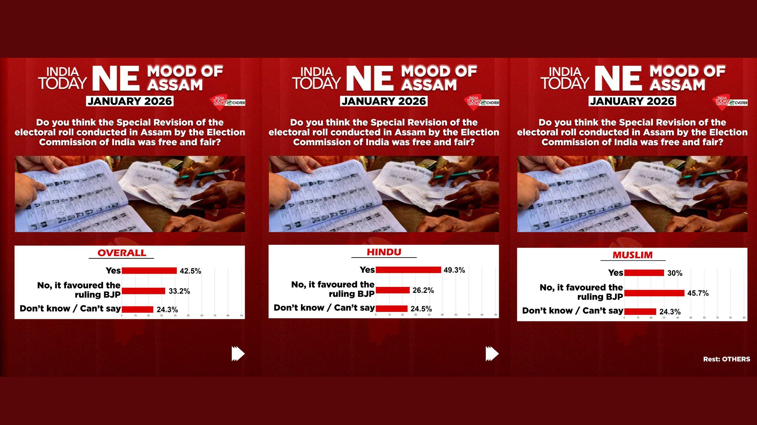 A 19-percentage point chasm separates how Hindu and Muslim voters view Assam's electoral integrity, with the India Today–CVoter Mood of the Nation poll conducted in January 2026 exposing a state fundamentally divided over the most basic democratic process—who gets to vote. While 49.3 per cent of Hindu respondents believe the Election Commission's Special Revision of electoral rolls was free and fair, only 30 per cent of Muslims share this confidence. Nearly half of Muslims—45.7 per cent—believe the revision was unfair, compared to just 26.2 per cent of Hindus.