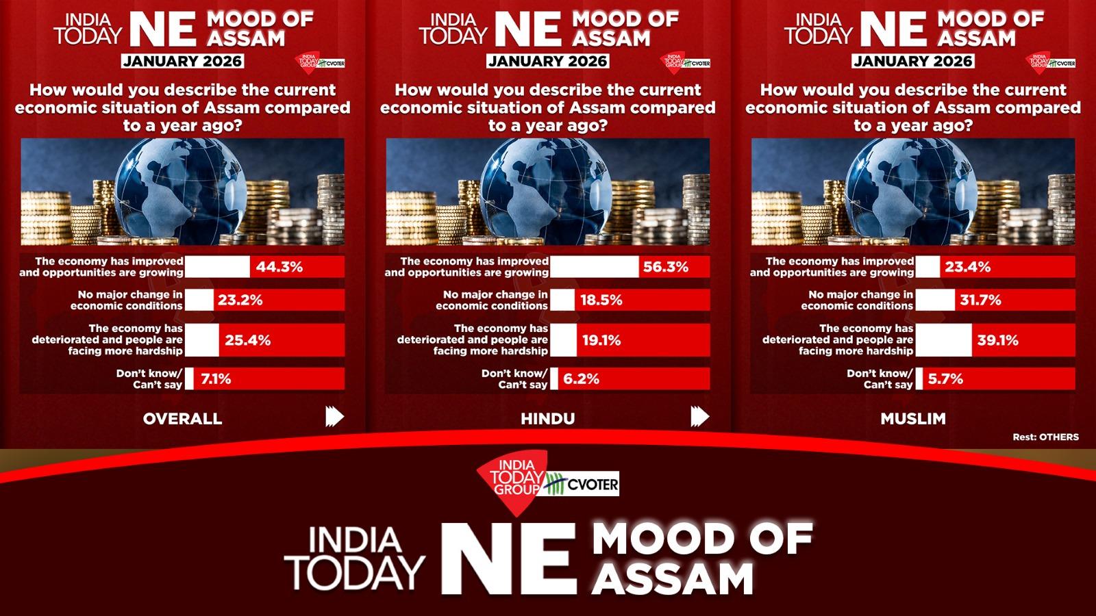 Public perception of Assam’s economy shows a mixed but largely optimistic picture, with sharp variations across communities, according to the latest India Today–CVoter Mood of the Nation (MOTN) survey conducted in January 2026.