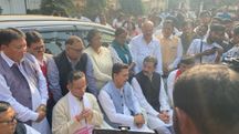 Former Chief Minister Tarun Gogoi celebrates with his party leaders at Manabendra Complex, Guwahati: